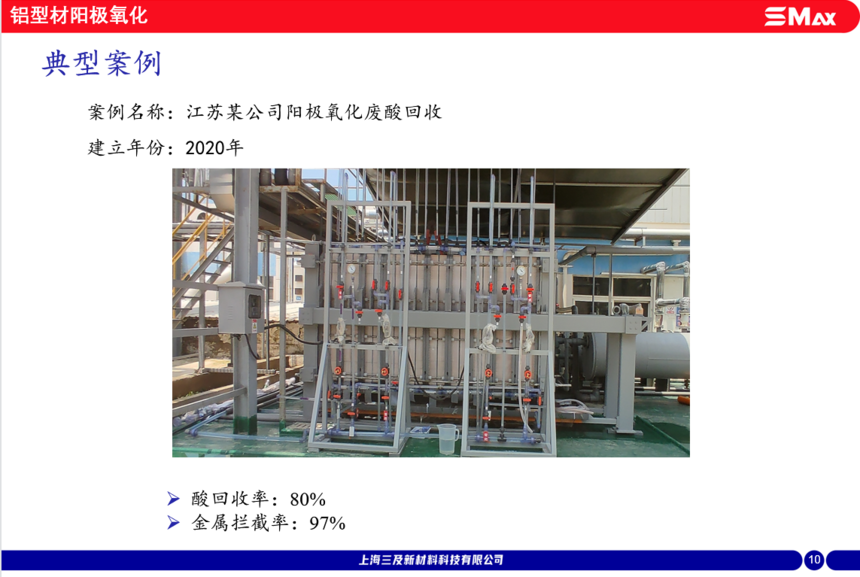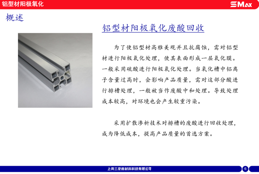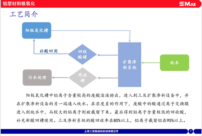 注:各种无机酸的回收能力大致关系为:盐酸≥硝酸>硫酸>氢氟酸>磷酸 铝型材阳极氧化工艺废酸 阳极氧化是铝型材表面处理的一种方法。在型材表面形成一层保护膜,从而提高型材表面耐磨、耐腐蚀性能。 问题: 解决方案: