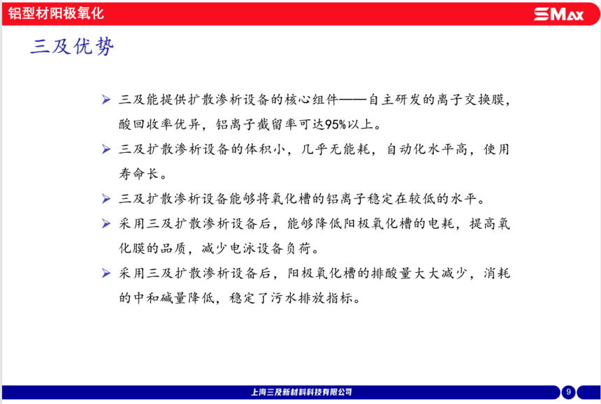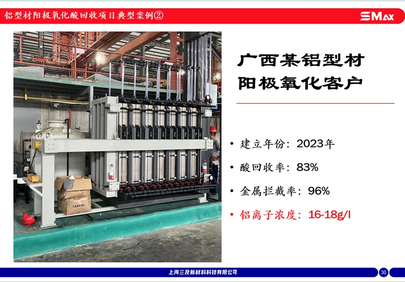 铝型材阳极氧化废酸资源化阳极氧化槽中铝离子含量较高的废酸溶液排出,进入到三及扩散渗析设备中,并在扩散渗析设备的另一端通入纯水。在浓度差的作用下,废酸中的酸通过离子交换膜进入到纯水中,而较大的铝离子则被截留下来。最后得到铝离子含量极低的回收酸,补充新酸回槽使用。三及渗析系统的酸回收率在80%以上,铝离子截留铝在95%以上。 ![]()