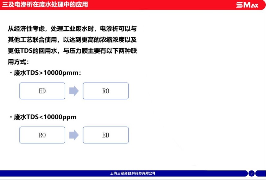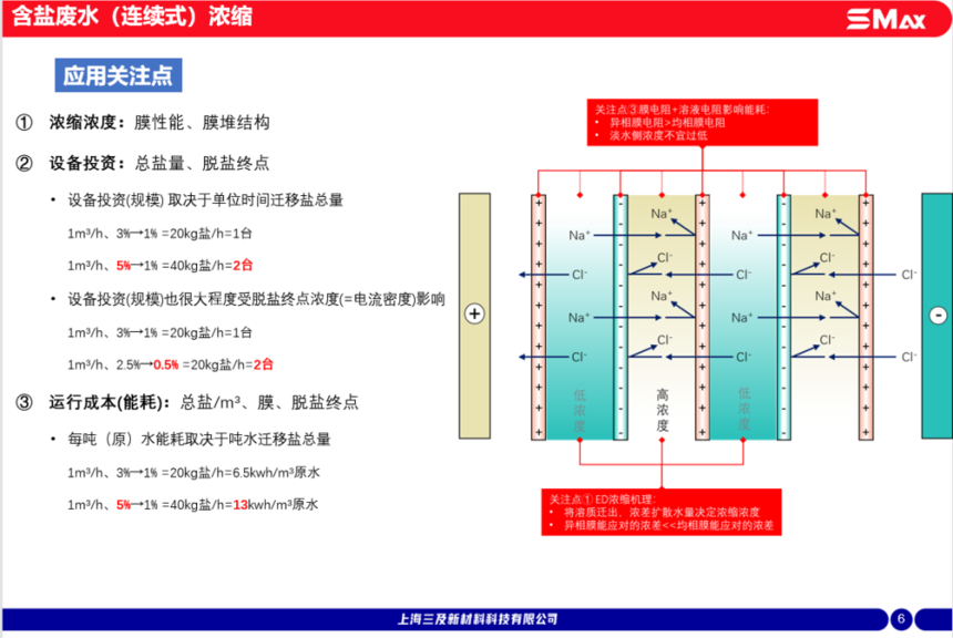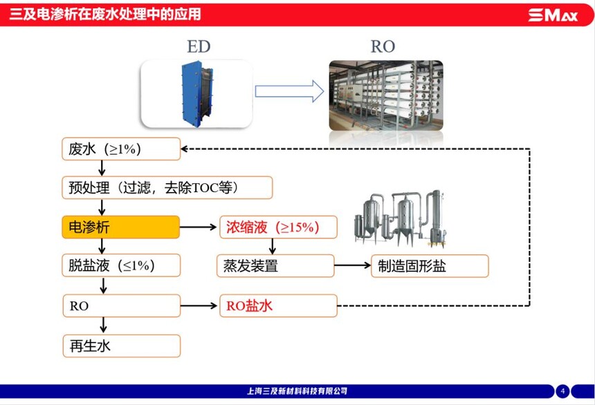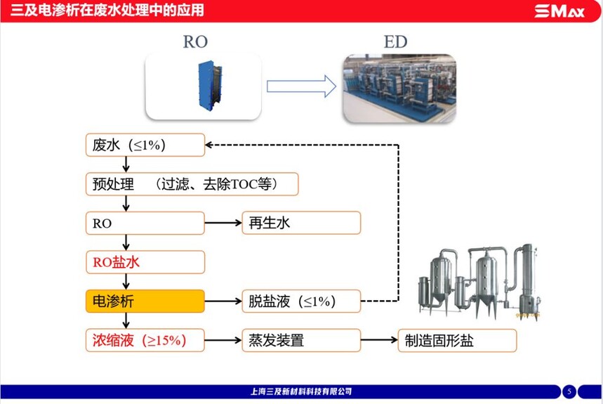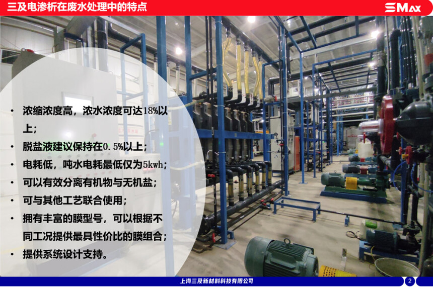浓缩浓度高,浓水浓度可达18%以上;脱盐液建议保持在0.5%以上电耗低,吨水电耗最低仅为5kwh;可以有效分离有机物与无机盐,可与其他工艺联合使用;拥有丰富的膜型号,可以根据不同工况提供最具性价比的膜组合,提供系统设计支持。