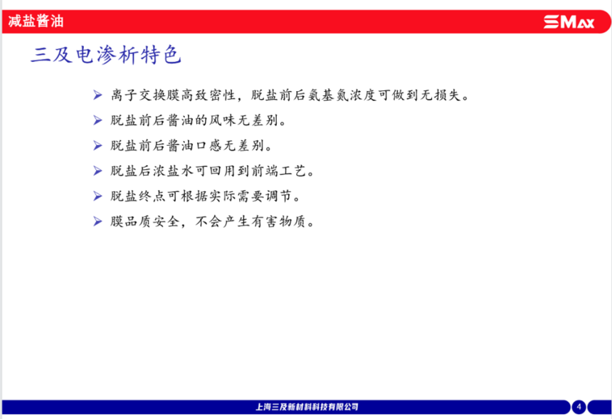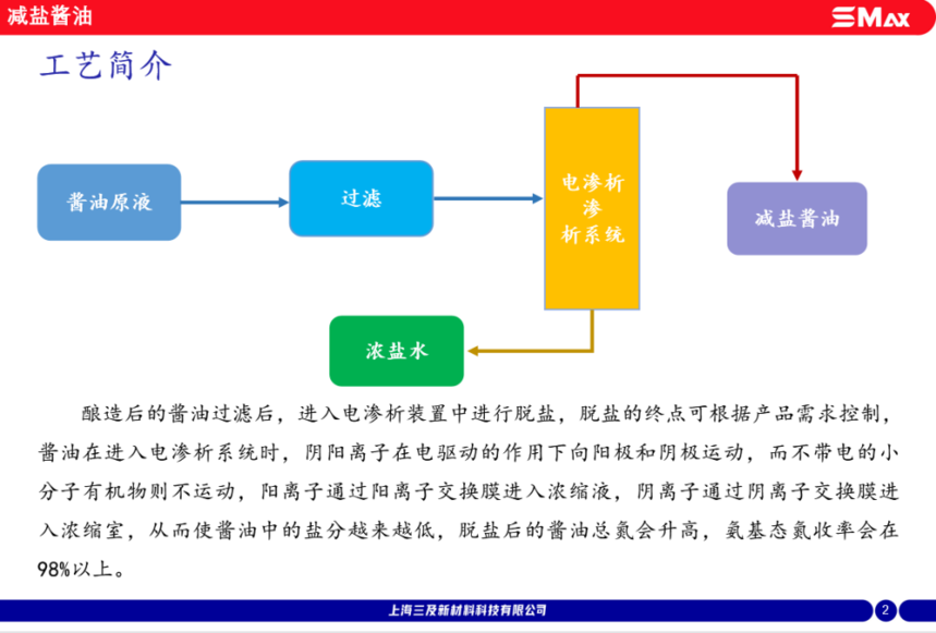 酿造后的酱油过滤后,进入电渗析装置中进行脱盐,脱盐的终点可根据产品需求控制酱油在进入电渗析系统时,阴阳离子在电驱动的作用下向阳极和阴极运动,而不带电的小分子有机物则不运动,阳离子通过阳离子交换膜进入浓缩液,阴离子通过阴离子交换膜进入浓缩室,从而使酱油中的盐分越来越低,脱盐后的酱油总氧会升高,氨基态氧收率会在98%以上。