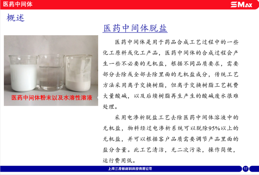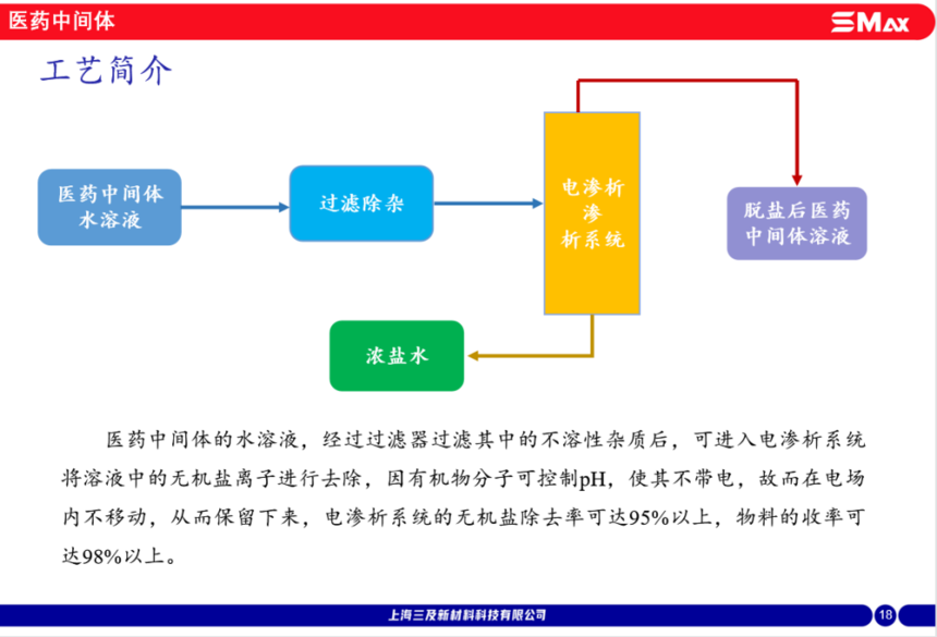 医药中间体是用于药品合成工艺过程中的一些化工原料或化工产品,医药中间体的合成过程会产生一些不必要的无机盐,根据不同品质要求,需要部分去除或全部去除里面的无机盐成分。