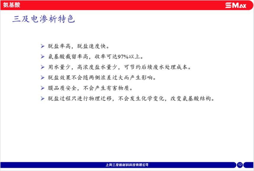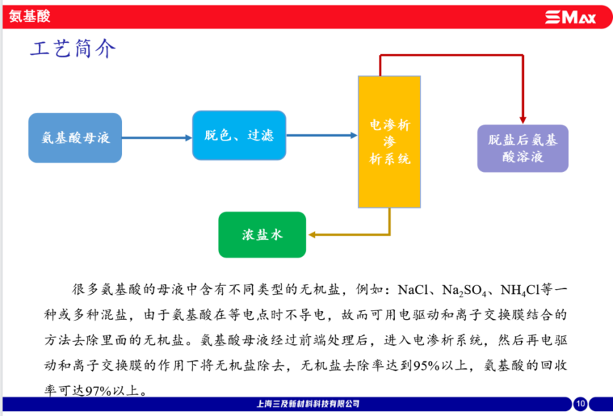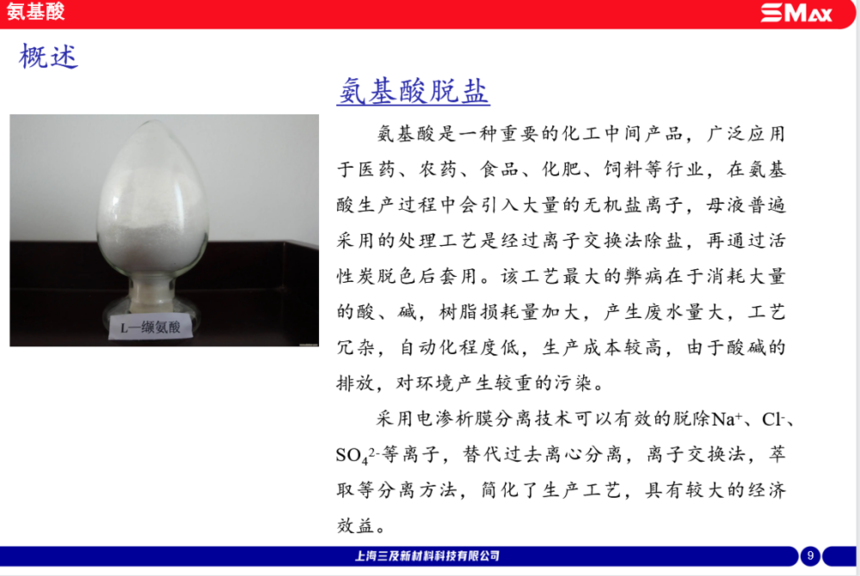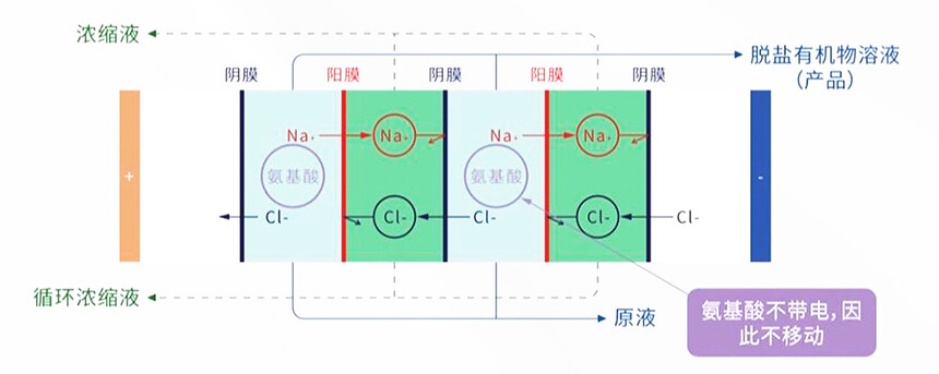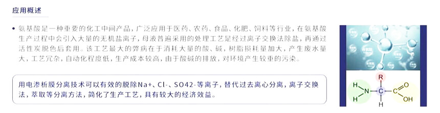 氨基酸是一种重要的化工中间产品,广泛应用于医药、农药、食品、化肥、饲料等行业,在氨基酸e生产过程中会引入大量的无机盐离子,母液普遍采用的处理工艺是经过离子交换法除盐,再通过活性炭脱色后套用。该工艺最大的弊病在于消耗大量的酸、碱,树脂损耗量加大,产生废水量大,工艺冗杂,自动化程度低,生产成本较高,由于酸碱的排放,对环境产生较重的污染。